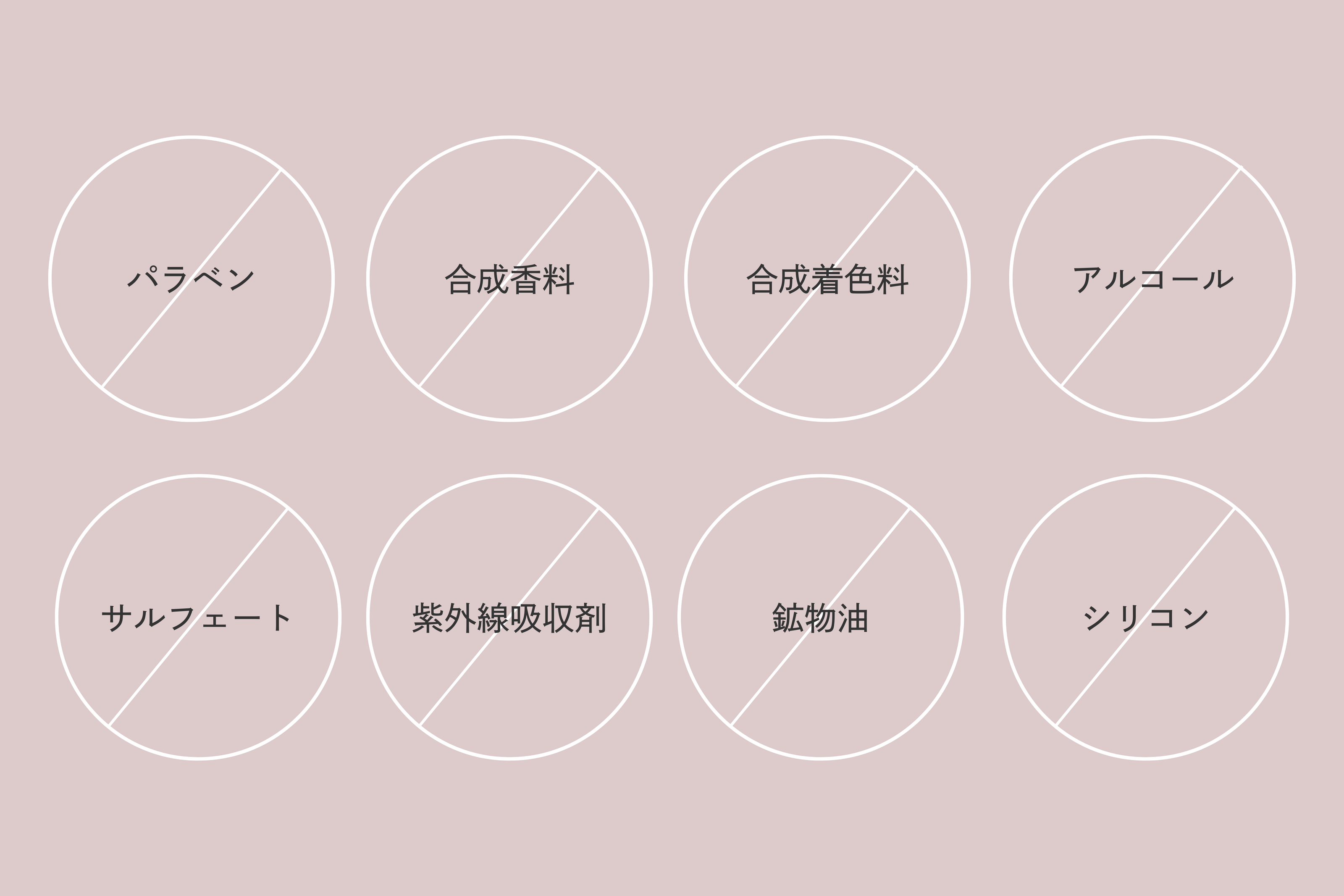 パラベン・合成香料・合成着色料・アルコール (エタノール)・サルフェート・紫外線吸収剤・鉱物油・シリコンすべて不使用。